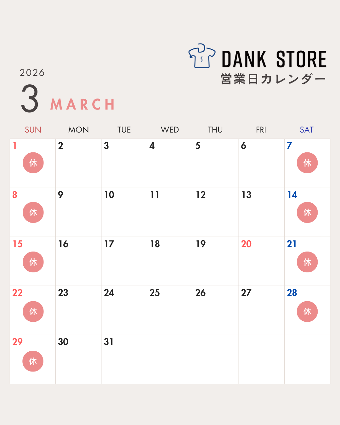 3月の営業日カレンダーを更新しました。
